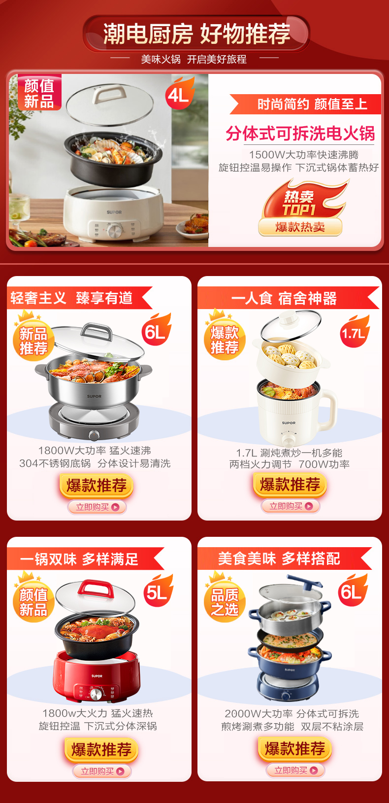• 1.6L精致容量,大口径加深,700W功率快速升温,五档火力调节,智能预约,不粘内锅!