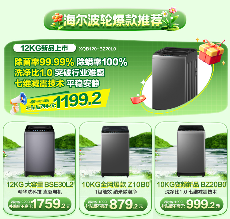 • 海尔(Haier)8公斤 家用 全自动波轮洗衣机 自编程 速洗 除菌 洗漂脱可调 消费补贴 清新换风XQB80-Z606