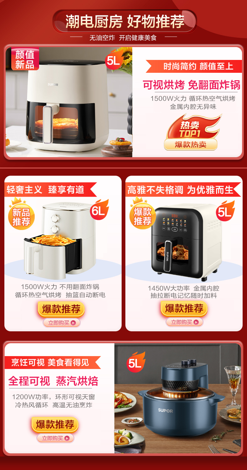 • 架空烘烤免翻面 双旋钮控温 抽蓝自动断电 蒸汽嫩炸 1650W猛火速炸 6L大容量