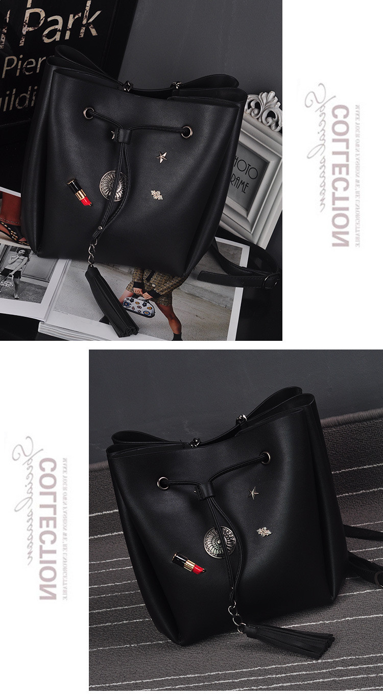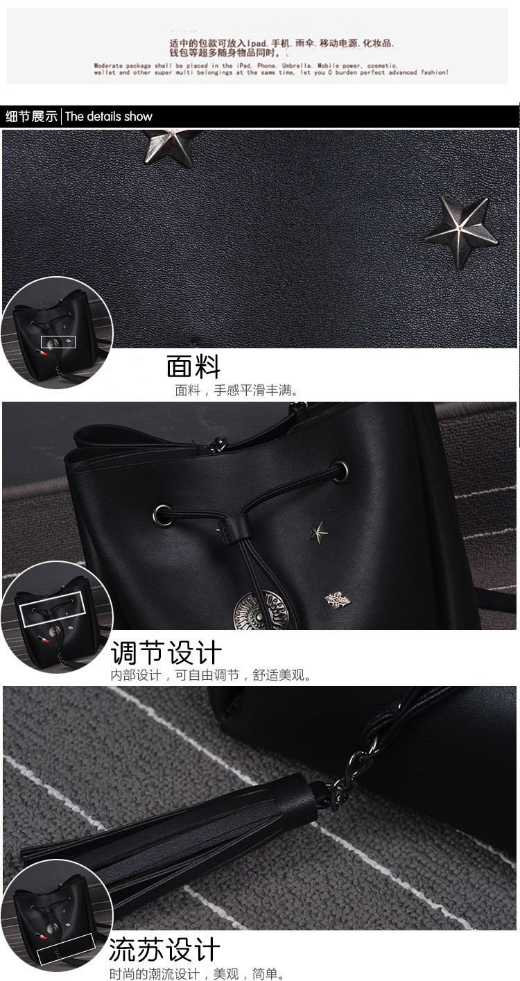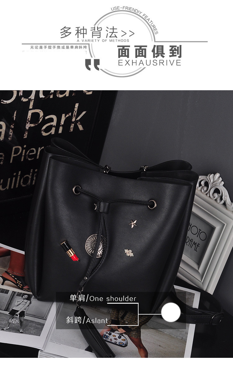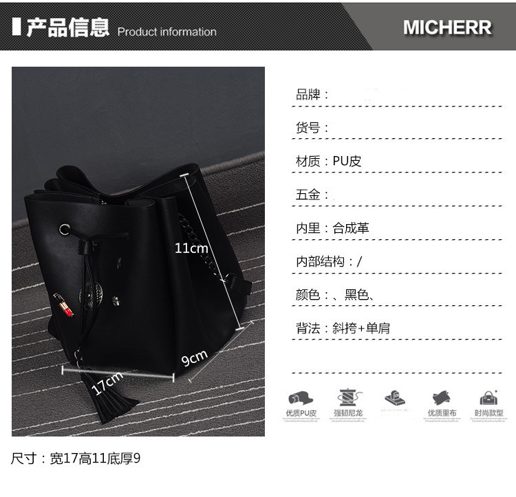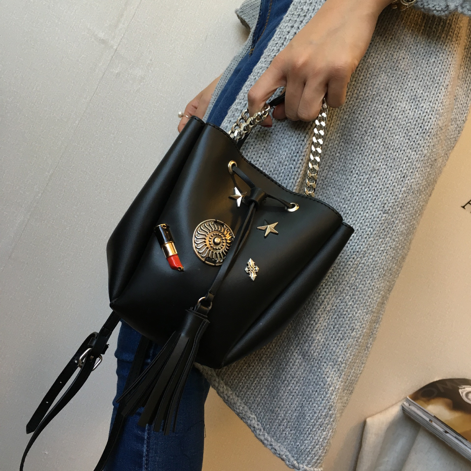 • 薇思黛 2016新款 欧美时尚黑色勋章水桶包女包 铆钉徽章抽带流苏链条单肩斜挎包
