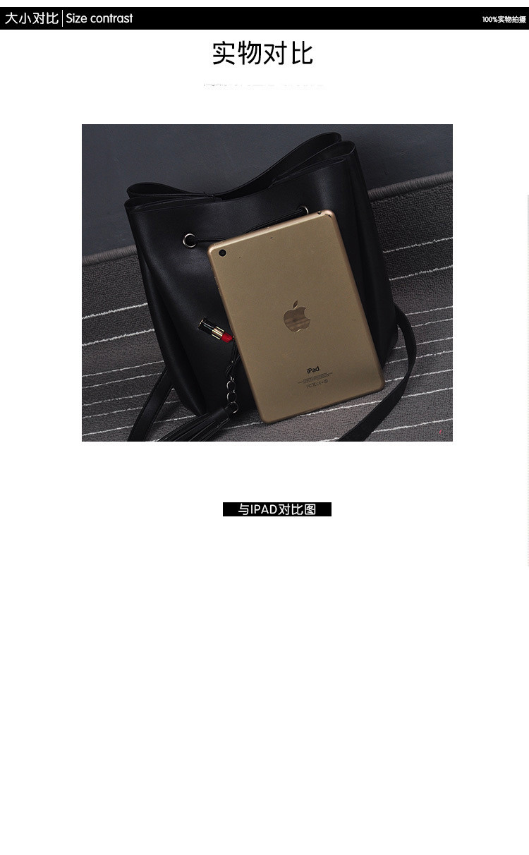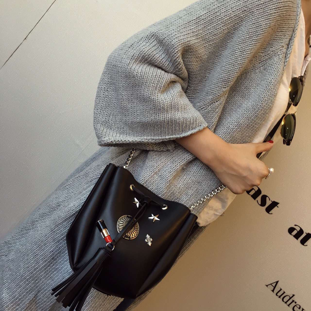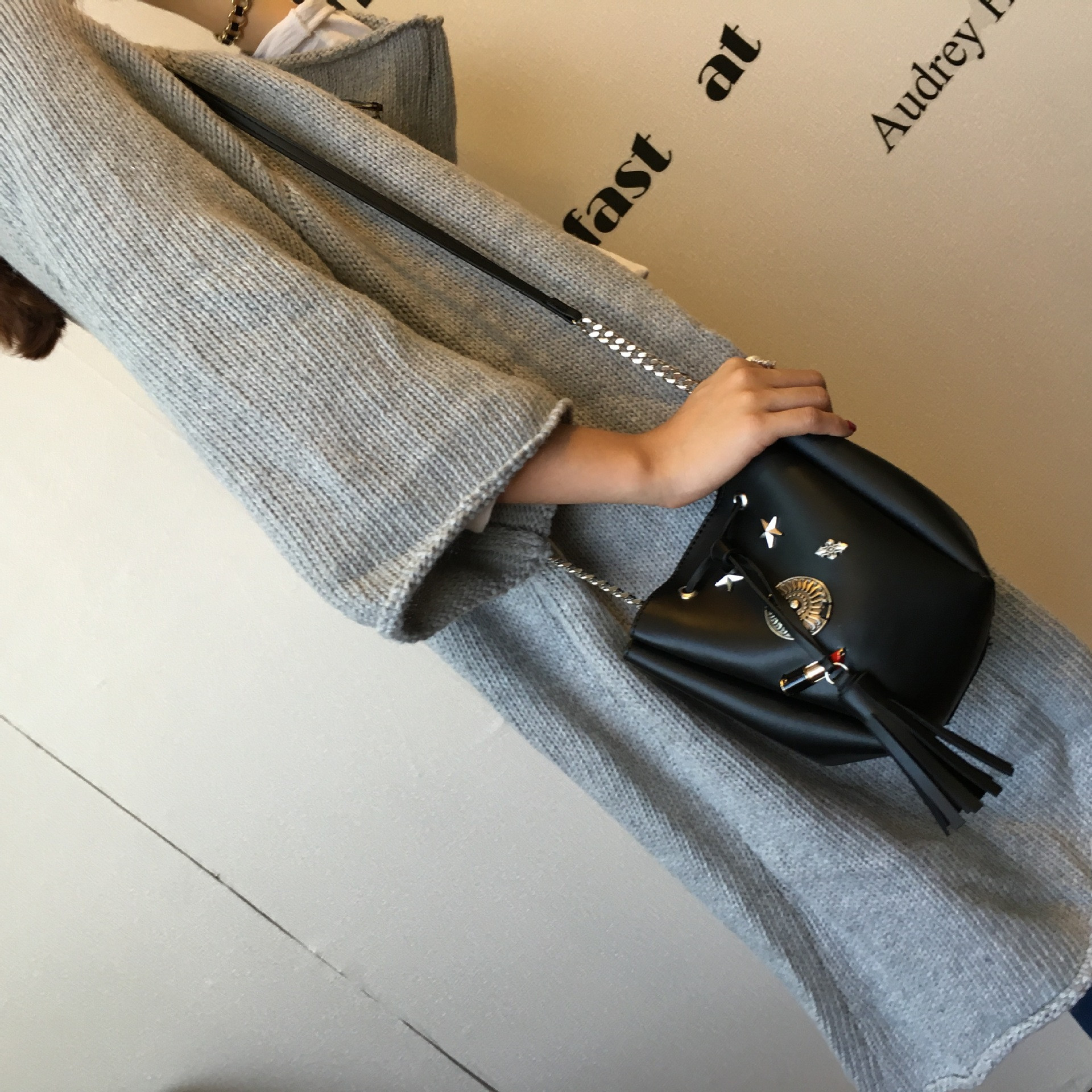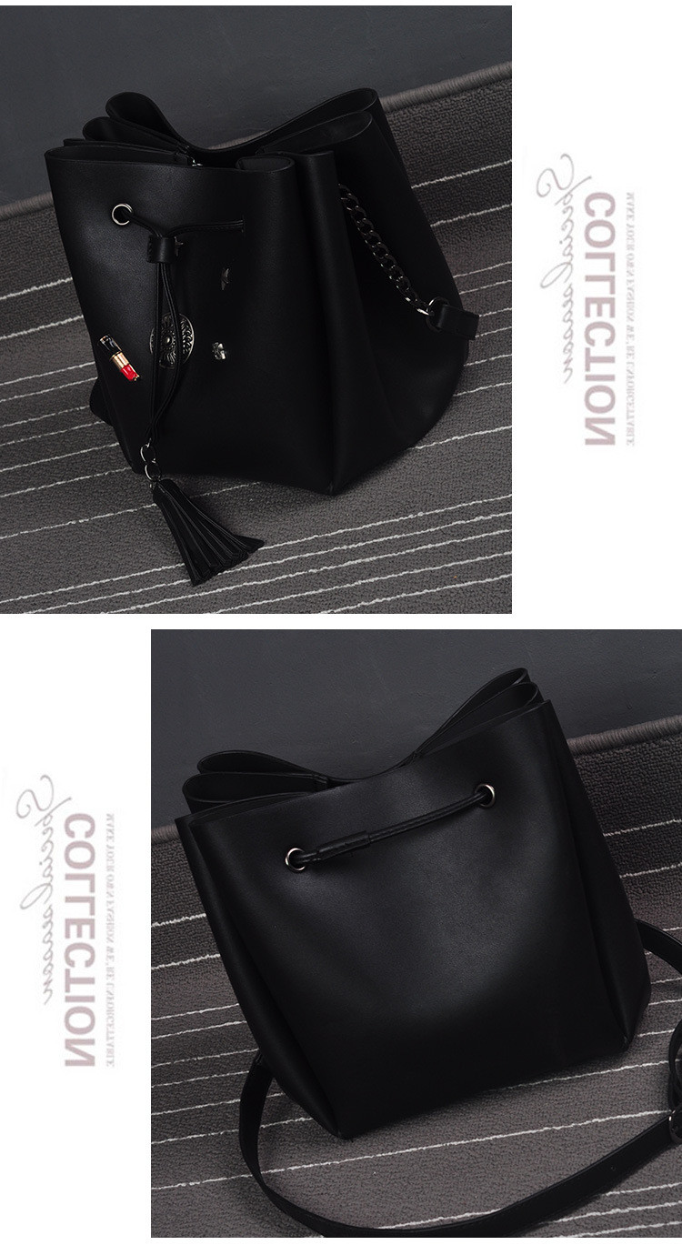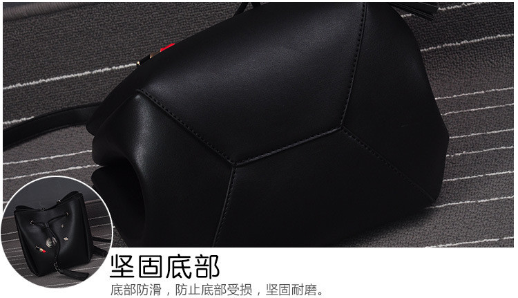 • 薇思黛 2016新款 欧美时尚黑色勋章水桶包女包 铆钉徽章抽带流苏链条单肩斜挎包