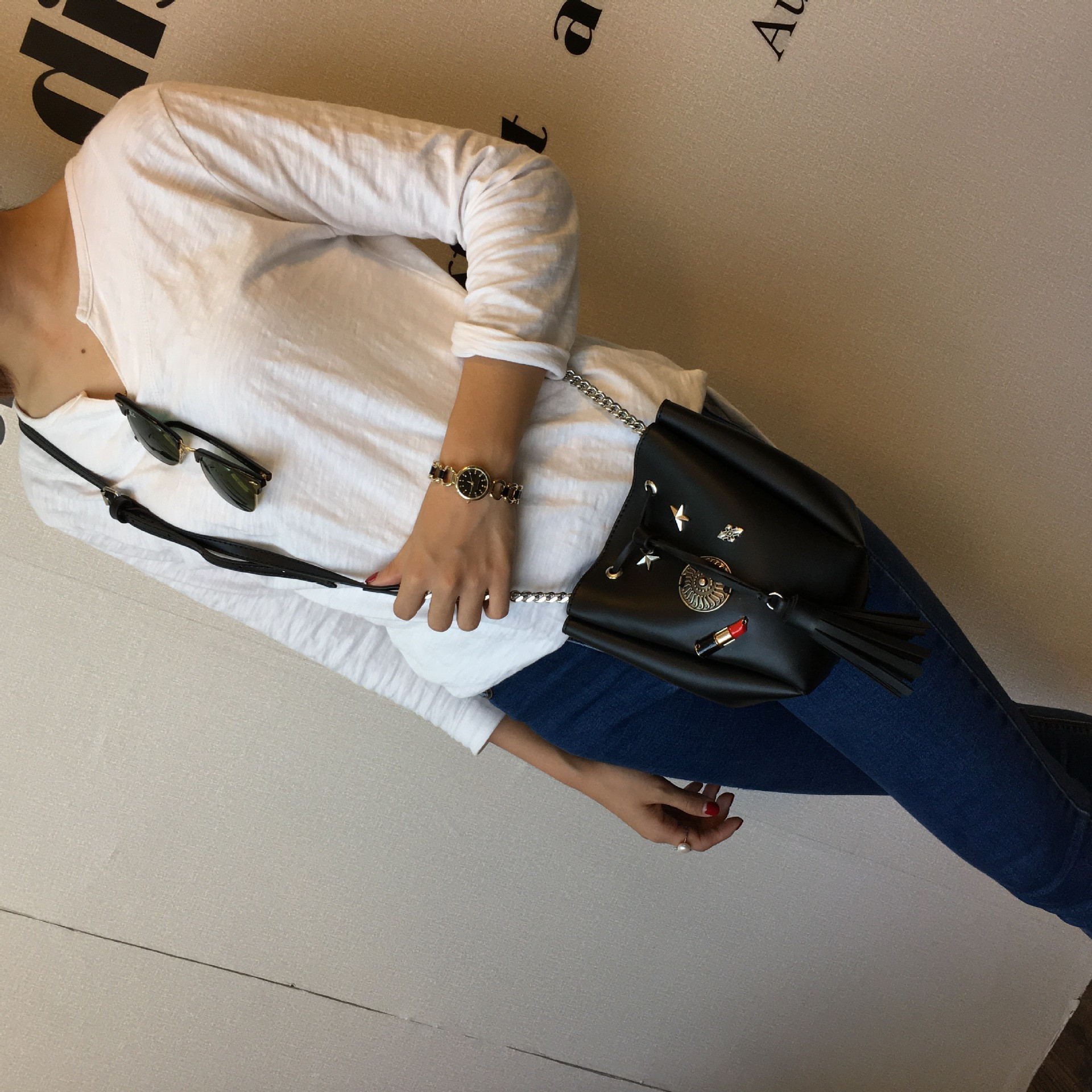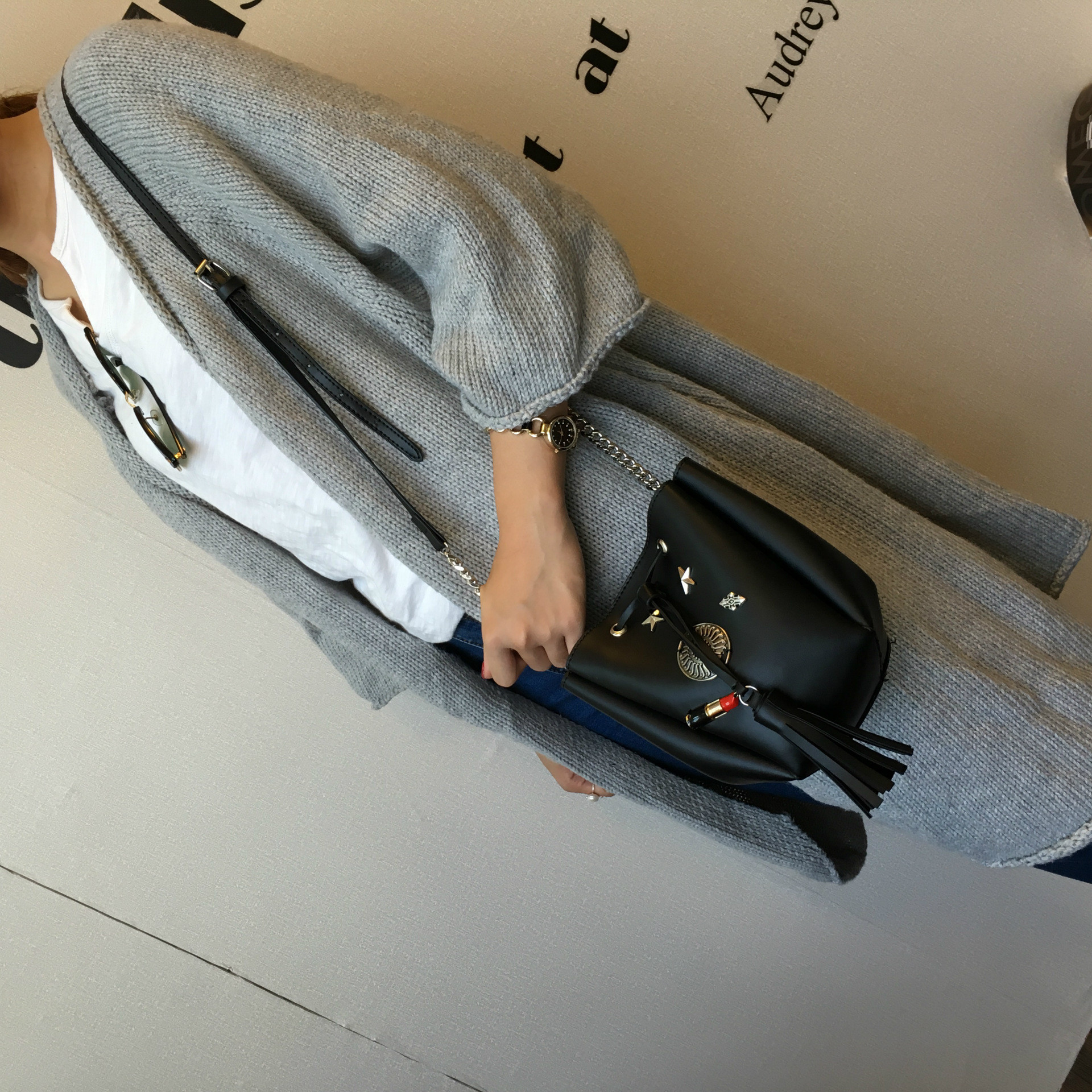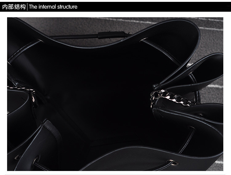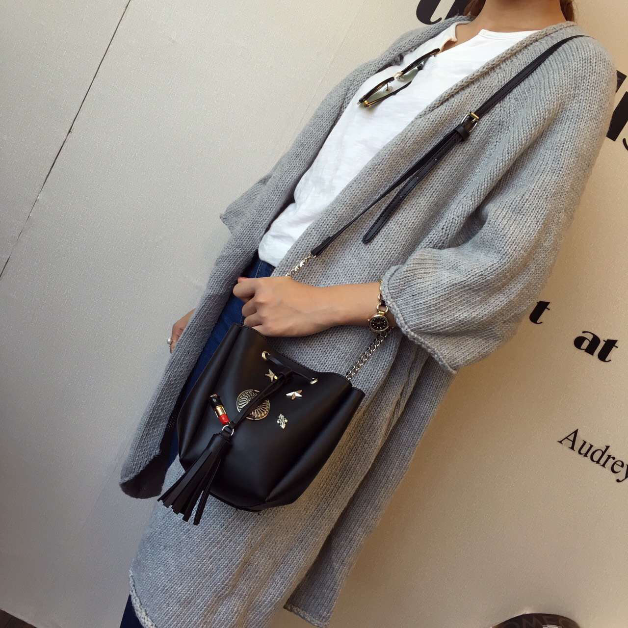 • 薇思黛 2016新款 欧美时尚黑色勋章水桶包女包 铆钉徽章抽带流苏链条单肩斜挎包