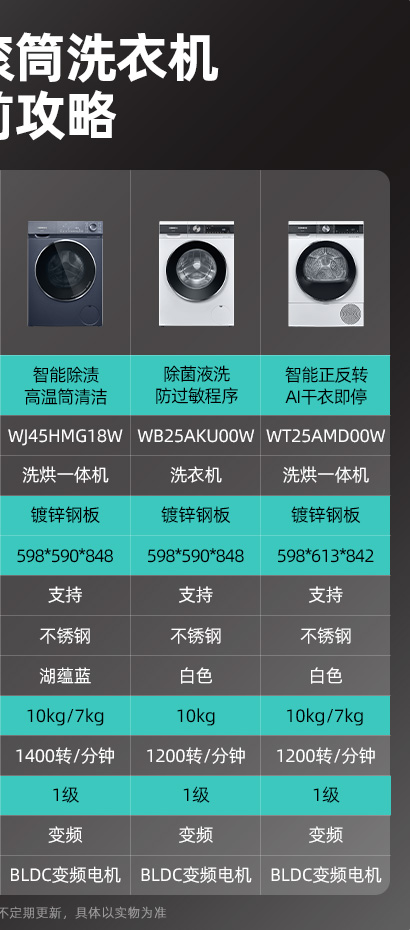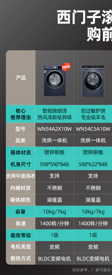 • 10公斤洗涤,7公斤烘干;智能除顽渍;热风清新祛异味;护肤防过敏;1400转变频