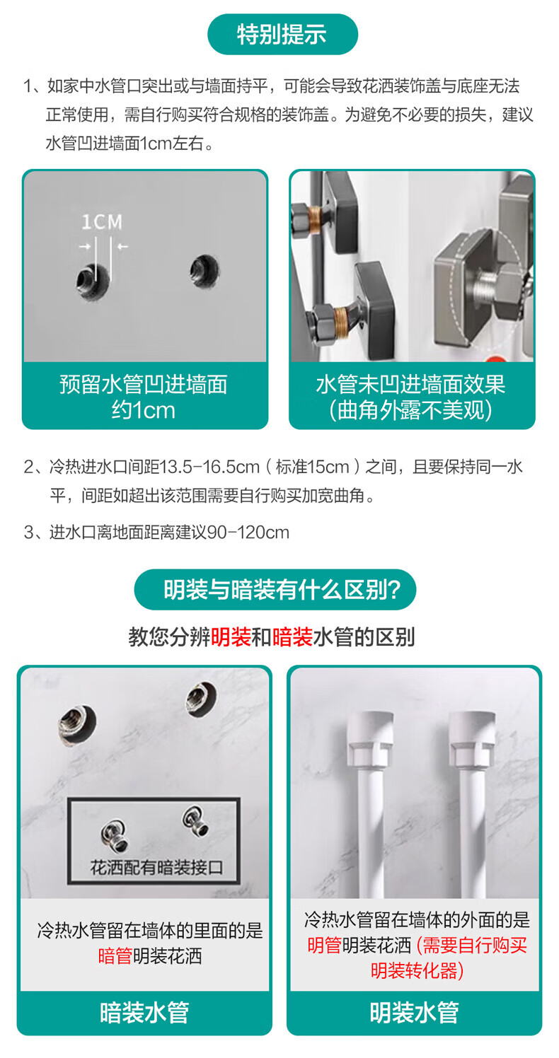 花洒是标准件,如因预留冷热出水口不标准造成的无法安装,需自行额外购买特殊配件,退换货运费自理。